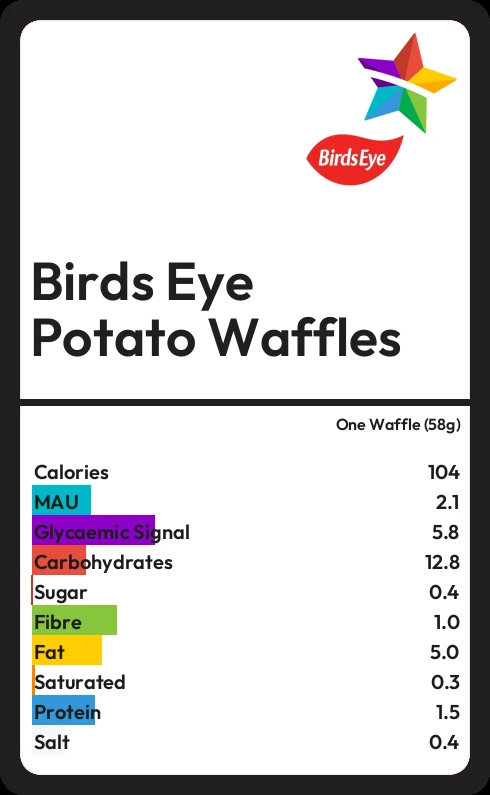 Birds Eye Potato Waffles contains 0.4g sugar in one Waffle (58g)