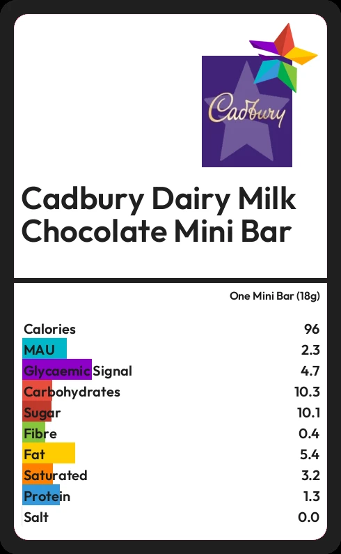 Cadbury Dairy Milk Chocolate Mini Bar contains 10.1g sugar in one Mini Bar (18g) - that is around 3 cubes of sugar.