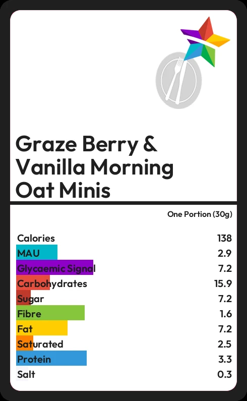 Graze Berry & Vanilla Morning Oat Minis contains 7.2g sugar in one Portion (30g) - that is around 2 cubes of sugar.