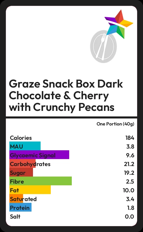 Graze Snack Box Dark Chocolate & Cherry with Crunchy Pecans contains 19.2g sugar in one Portion (40g) - that is around 5 cubes of sugar.