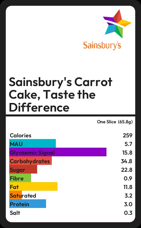 Sainsbury's Carrot Cake, Taste the Difference contains 22.8g sugar in one Slice (65.8g) - that is around 6 cubes of sugar.