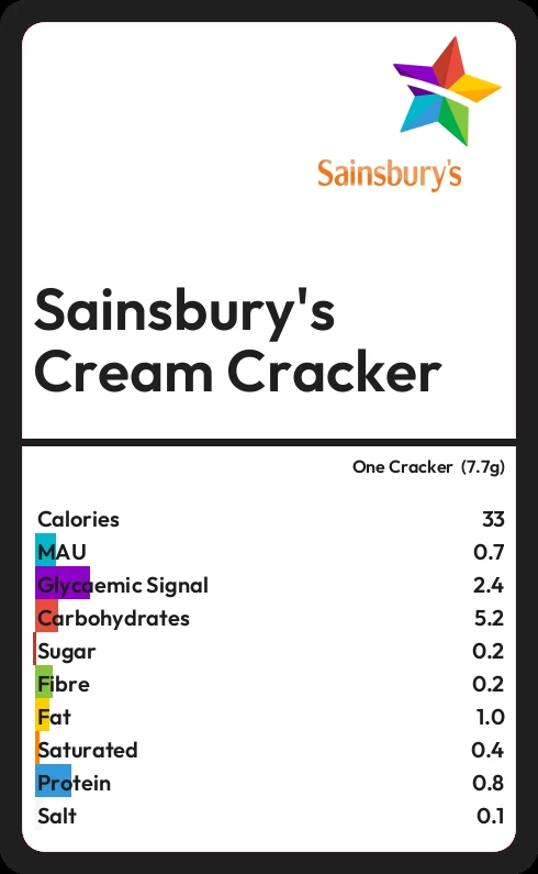 Sainsbury's Cream Cracker contains 0.2g sugar in one Cracker (7.7g)