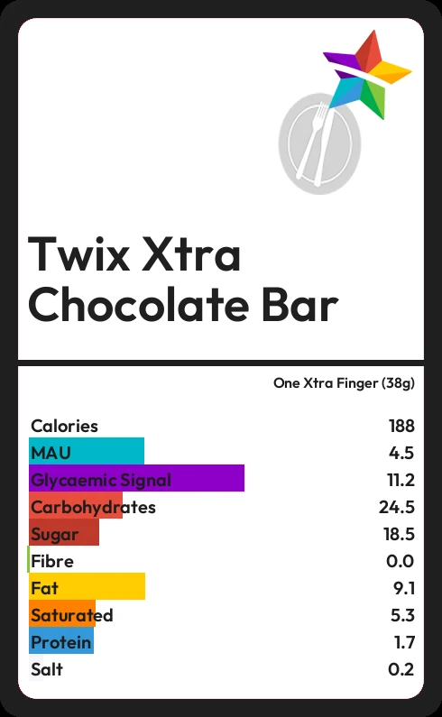 Twix Xtra Chocolate Bar contains 18.5g sugar in one Xtra Finger (38g) - that is around 5 cubes of sugar.