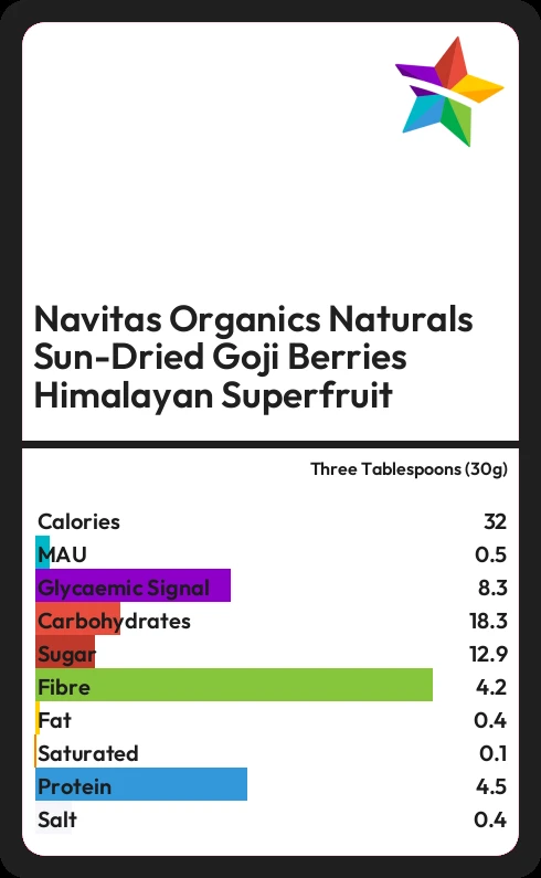 Navitas Organics Naturals Sun-Dried Goji Berries Himalayan Superfruit contains 12.9g sugar in three Tablespoons (30g) - that is around 3 cubes of sugar.