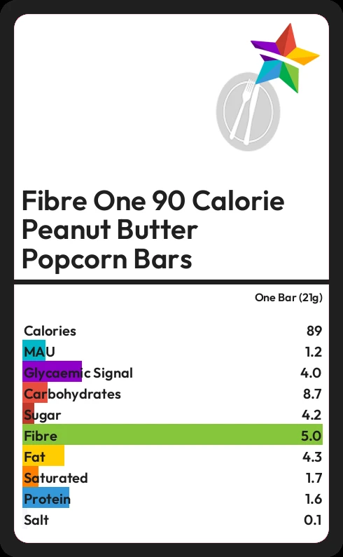 Fibre One 90 Calorie Peanut Butter Popcorn Bars contains 89 calories in one Bar (21g).