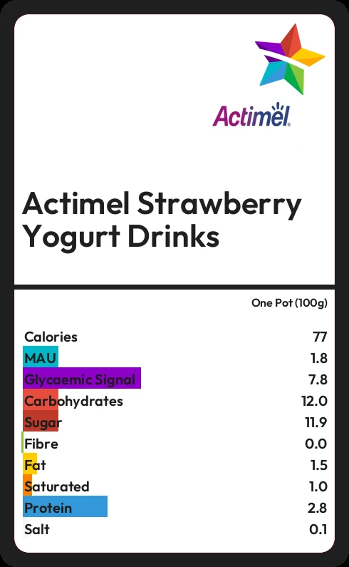 Actimel Strawberry Yogurt Drinks contains 77 calories in one Pot (100g).