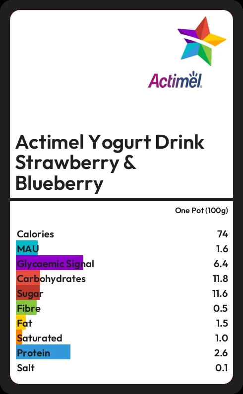 Actimel Yogurt Drink Strawberry & Blueberry contains 11.6g sugar in one Pot (100g) - that is around 3 cubes of sugar.