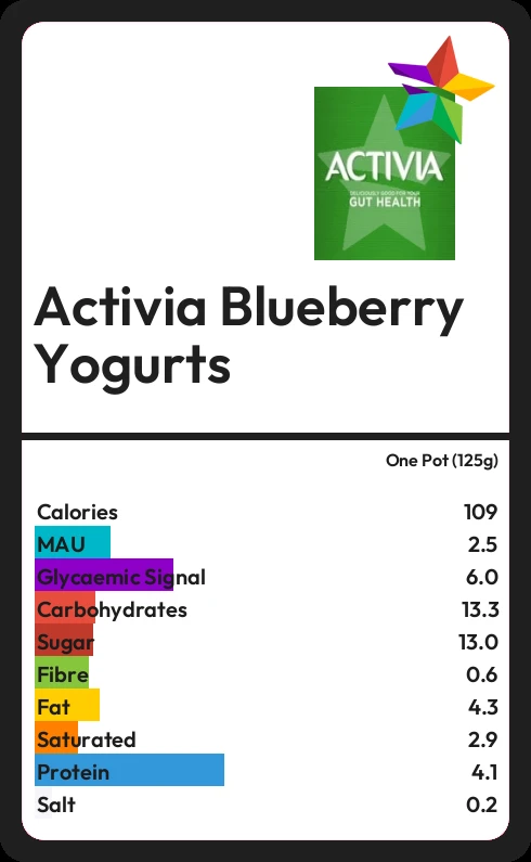 Ingredients Yogurt (Milk), Sugar (6%), Blueberry (5%), Blackcurrant Puree (3%), Modified Maize Starch, Natural Flavourings, Elderberry Concentrate, Acidity Regulator (Sodium Citrate), Stabiliser (Pectin)