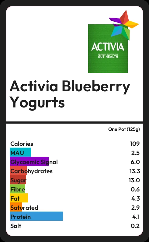 Activia Blueberry Yogurts contains 13.0g sugar in one Pot (125g) - that is around 3 cubes of sugar.