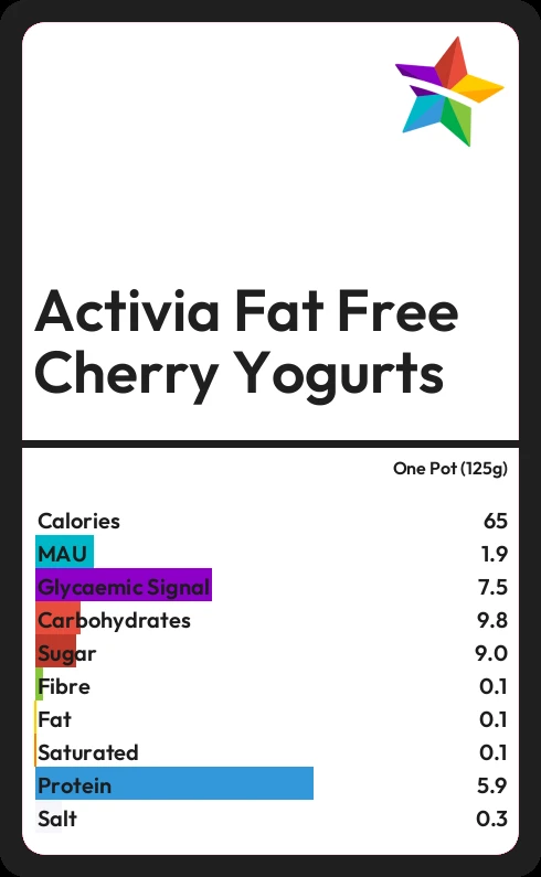 Activia Fat Free Cherry Yogurts contains 9.0g sugar in one Pot (125g) - that is around 2 cubes of sugar.