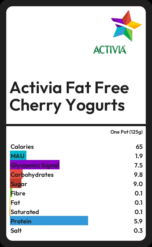 Activia Fat Free Cherry Yogurts contains 65 calories in one Pot (125g).