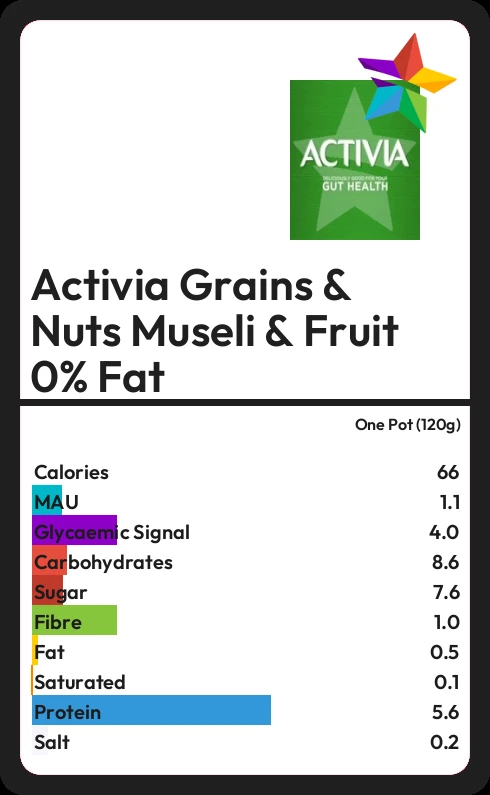 Activia Grains & Nuts Museli & Fruit 0% Fat contains 66 calories in one Pot (120g).