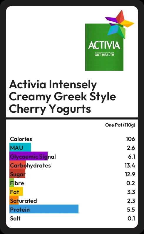 Activia Intensely Creamy Greek Style Cherry Yogurts contains 12.9g sugar in one Pot (110g) - that is around 3 cubes of sugar.