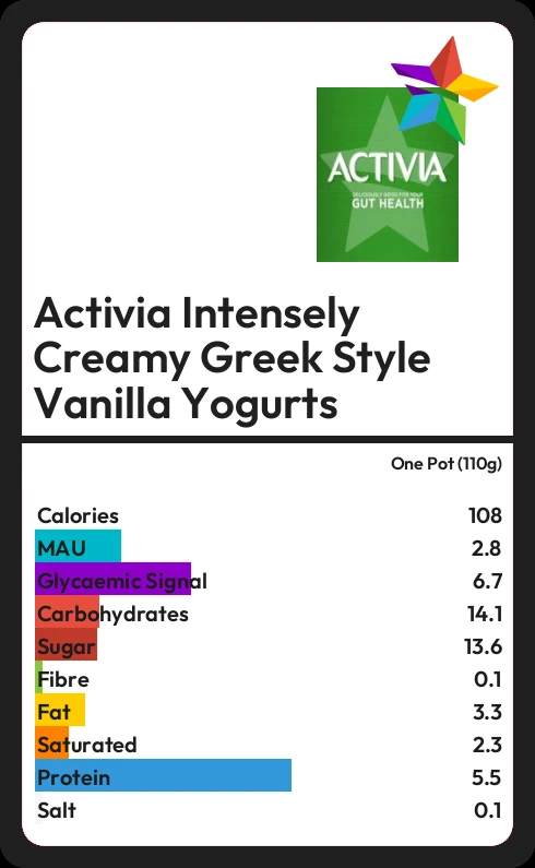 Activia Intensely Creamy Greek Style Vanilla Yogurts contains 107.8 calories in one Pot (110g).