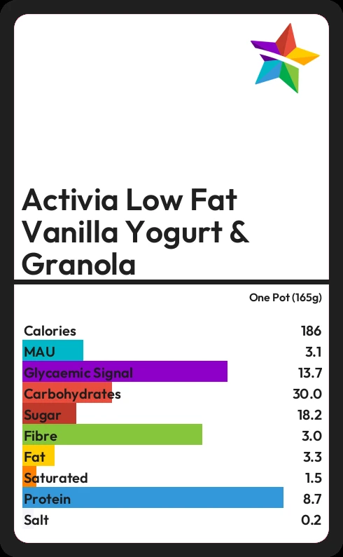 Activia Low Fat Vanilla Yogurt & Granola contains 186.5 calories in one Pot (165g).