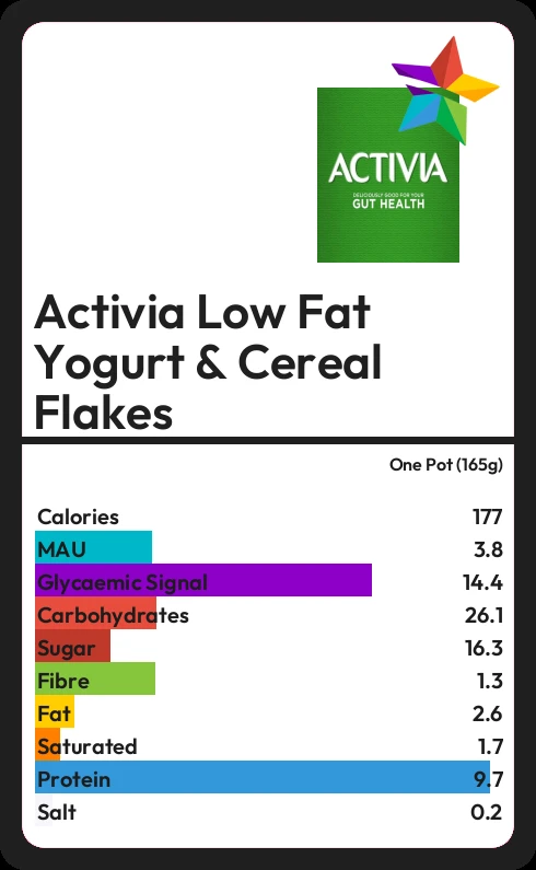 Activia Low Fat Yogurt & Cereal Flakes contains 176.6 calories in one Pot (165g).