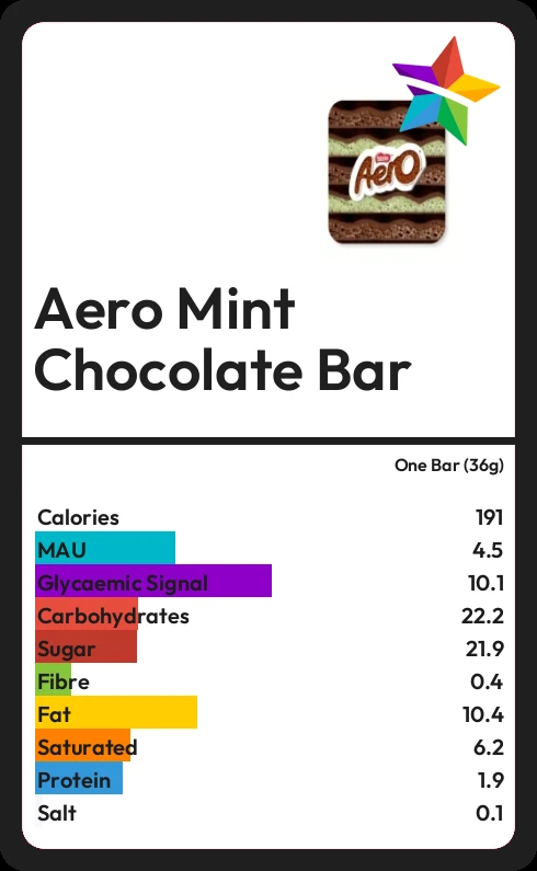 Aero Mint Chocolate Bar contains 21.9g sugar in one Bar (36g) - that is around 5 cubes of sugar.