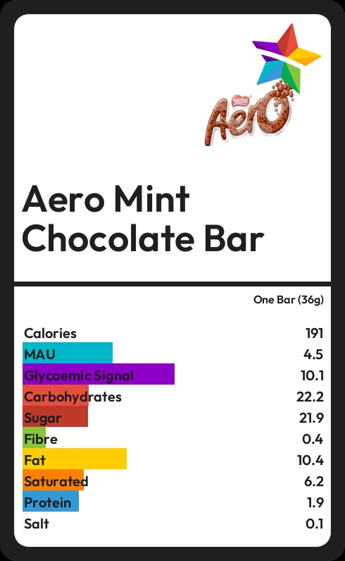 Aero Mint Chocolate Bar contains 21.9g sugar in one Bar (36g) - that is around 5 cubes of sugar.