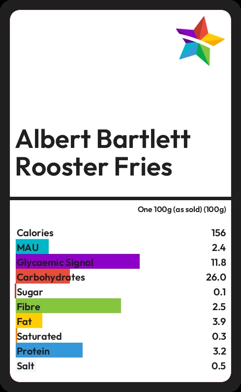 Albert Bartlett Rooster Fries contains 156 calories in one 100g (as sold) (100g).