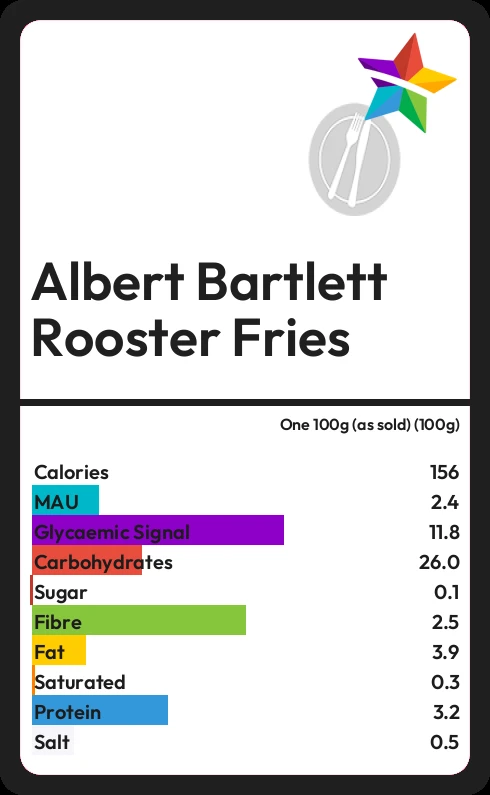 Albert Bartlett Rooster Fries contains 156 calories in one 100g (as sold) (100g).