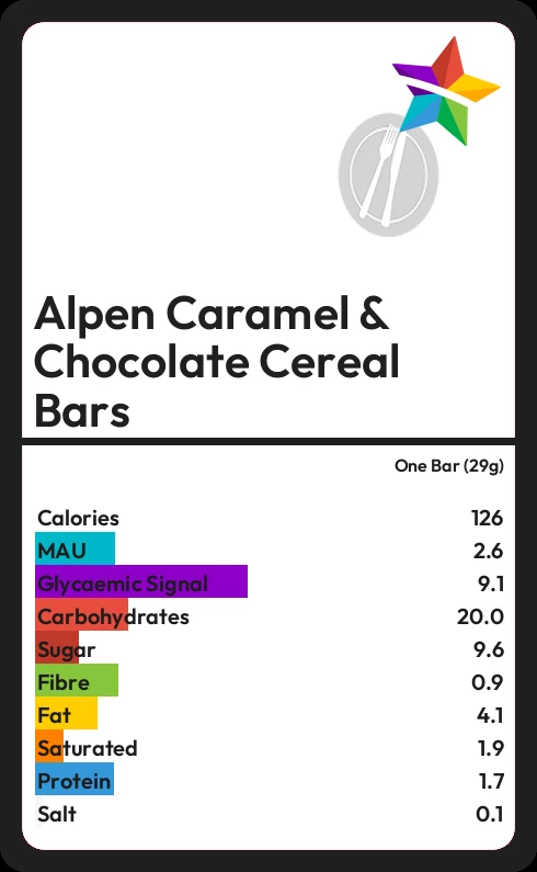 Alpen Caramel & Chocolate Cereal Bars contains 9.6g sugar in one Bar (29g) - that is around 2 cubes of sugar.