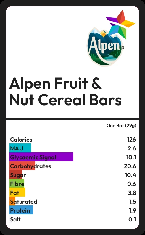 Alpen Fruit & Nut Cereal Bars contains 10.4g sugar in one Bar (29g) - that is around 3 cubes of sugar.