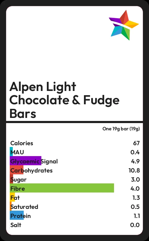 Alpen Light Chocolate & Fudge Bars contains 67.3 calories in one 19g bar (19g).