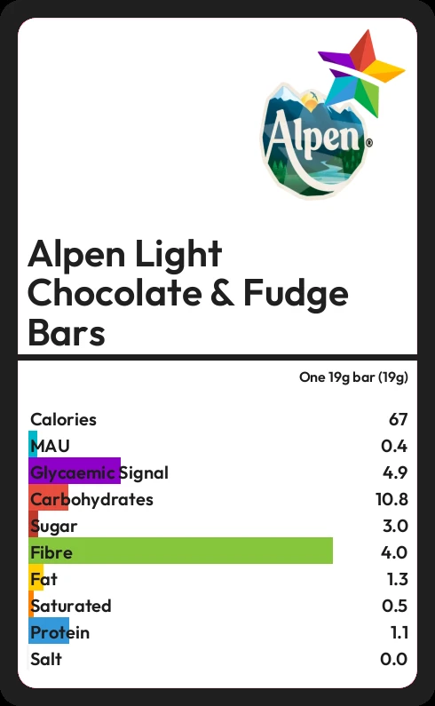 Alpen Light Chocolate & Fudge Bars contains 67.3 calories in one 19g bar (19g).
