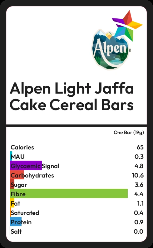 Alpen Light Jaffa Cake Cereal Bars contains 64.8 calories in one Bar (19g).