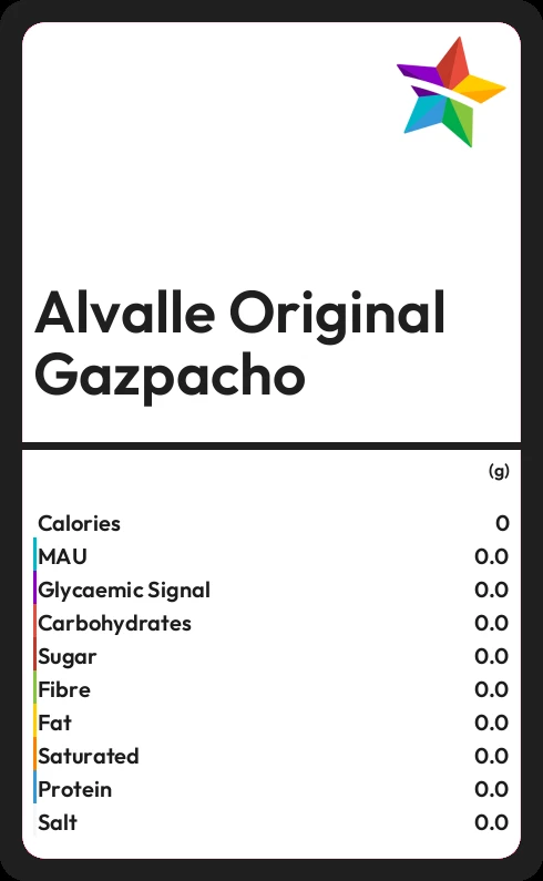 In 100g of Alvalle Original Gazpacho there are 2.6g of fat of which 0.4g are saturated.