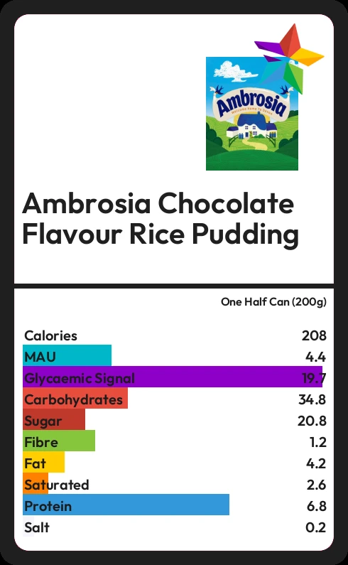 Ambrosia Chocolate Flavour Rice Pudding contains 208 calories in one Half Can (200g).