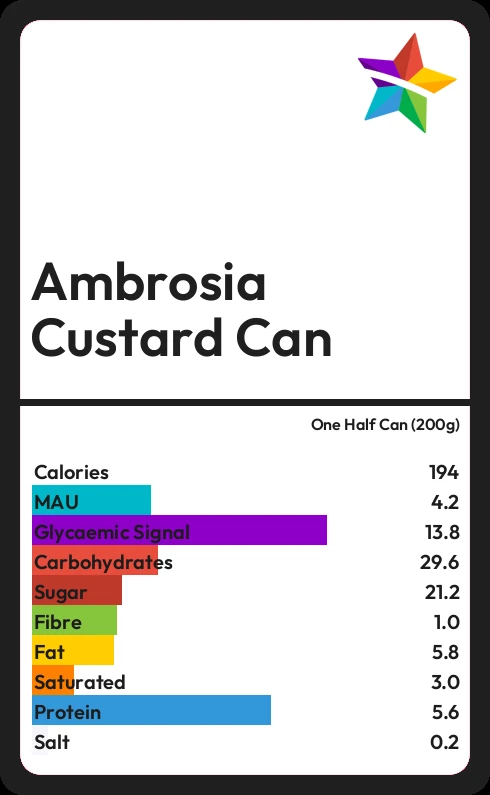 Ambrosia Custard Can contains 21.2g sugar in one Half Can (200g) - that is around 5 cubes of sugar.