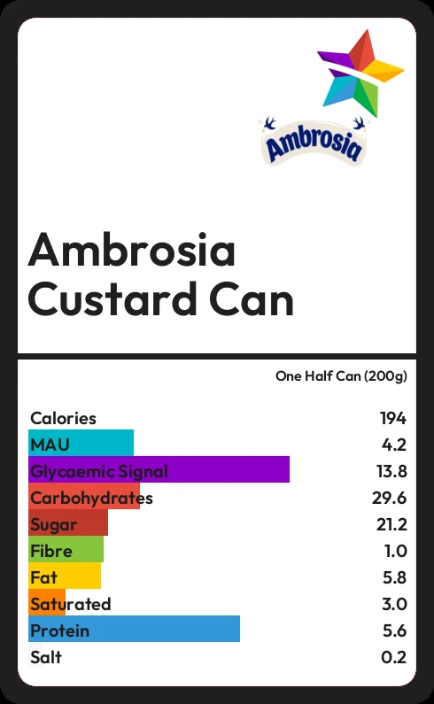 Ambrosia Custard Can contains 21.2g sugar in one Half Can (200g) - that is around 5 cubes of sugar.