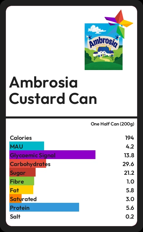 Ambrosia Custard Can contains 21.2g sugar in one Half Can (200g) - that is around 5 cubes of sugar.