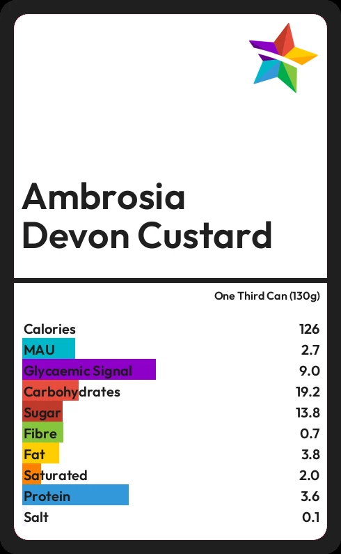 Ambrosia Devon Custard contains 126.1 calories in one Third Can (130g).