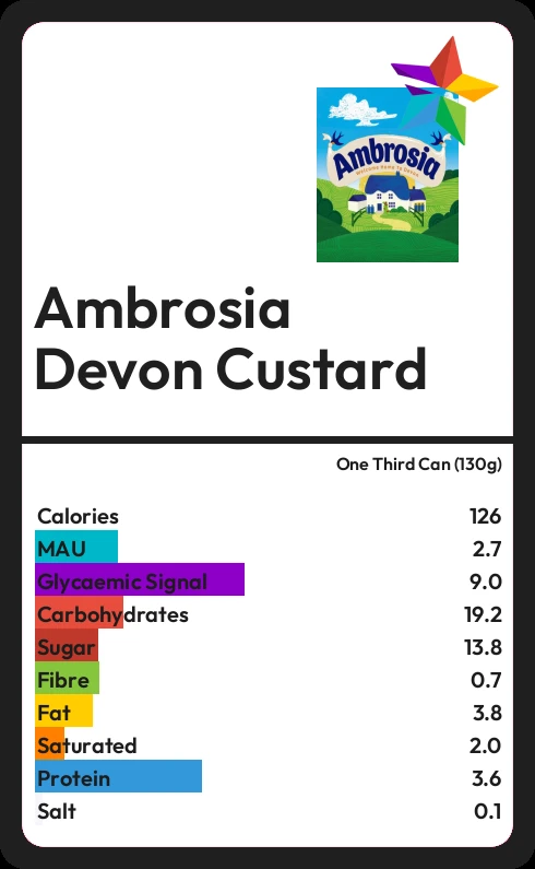 Ambrosia Devon Custard contains 126.1 calories in one Third Can (130g).