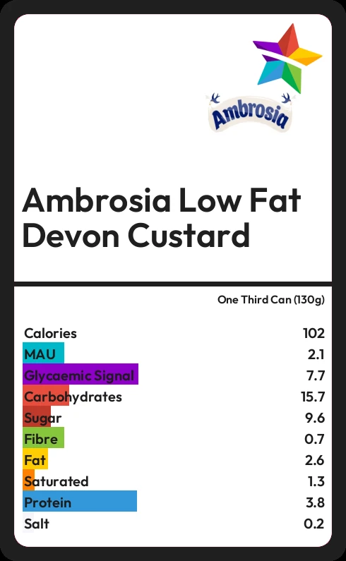 Ambrosia Low Fat Devon Custard contains 102.7 calories in one Third Can (130g).