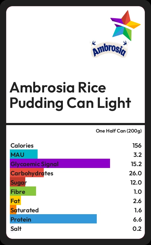 Ambrosia Rice Pudding Can Light contains 156 calories in one Half Can (200g).