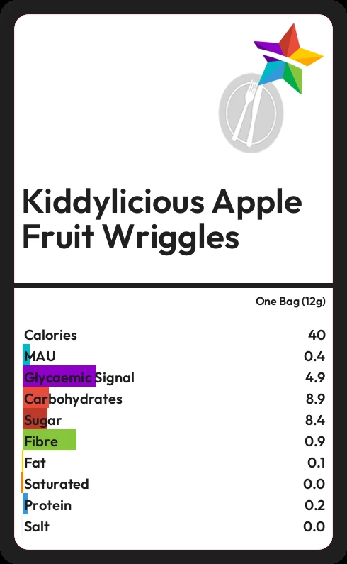 Kiddylicious Apple Fruit Wriggles contains 39.6 calories in one Bag (12g).
