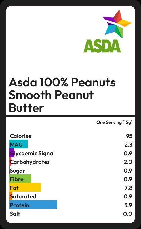 Asda 100% Peanuts Smooth Peanut Butter contains 95 calories in one Serving (15g).