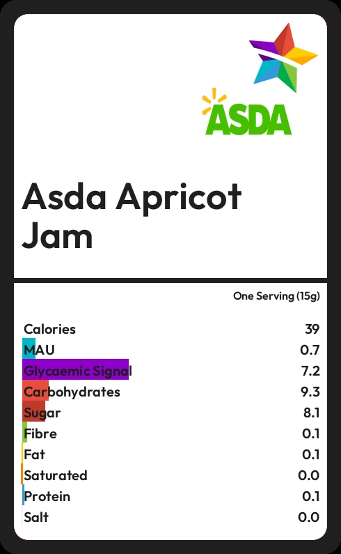 Asda Apricot Jam contains 38.6 calories in one Serving (15g).