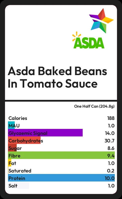 Asda Baked Beans In Tomato Sauce contains 188.4 calories in one Half Can (204.8g).