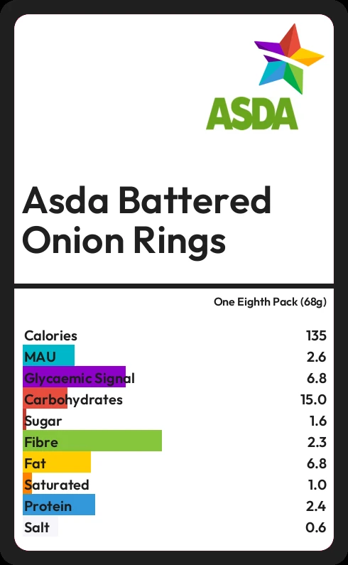 Asda Battered Onion Rings contains 1.6g sugar in one Eighth Pack (68g)