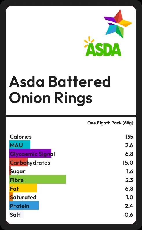 Asda Battered Onion Rings contains 1.6g sugar in one Eighth Pack (68g)