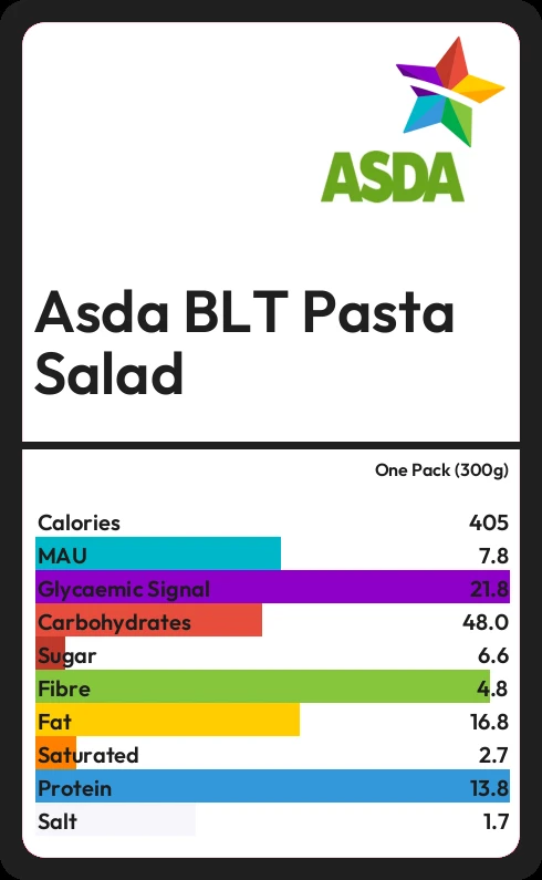 Asda BLT Pasta Salad contains 405 calories in one Pack (300g).