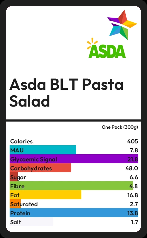 Asda BLT Pasta Salad contains 405 calories in one Pack (300g).