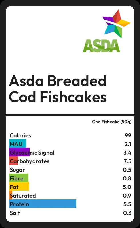 Asda Breaded Cod Fishcakes contains 0.5g sugar in one Fishcake (50g)