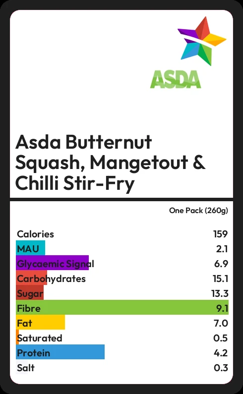 Asda Butternut Squash, Mangetout & Chilli Stir-Fry contains 158.6 calories in one Pack (260g).