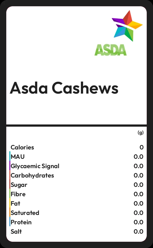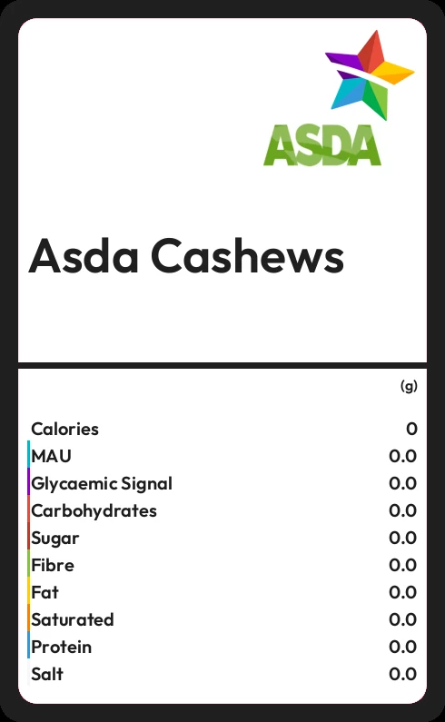 In 100g of Asda Cashews there are 48.0g of fat of which 9.5g are saturated.
