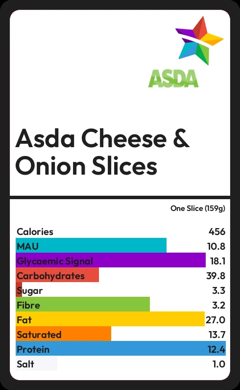 Asda Cheese & Onion Slices contains 456.3 calories in one Slice (159g).